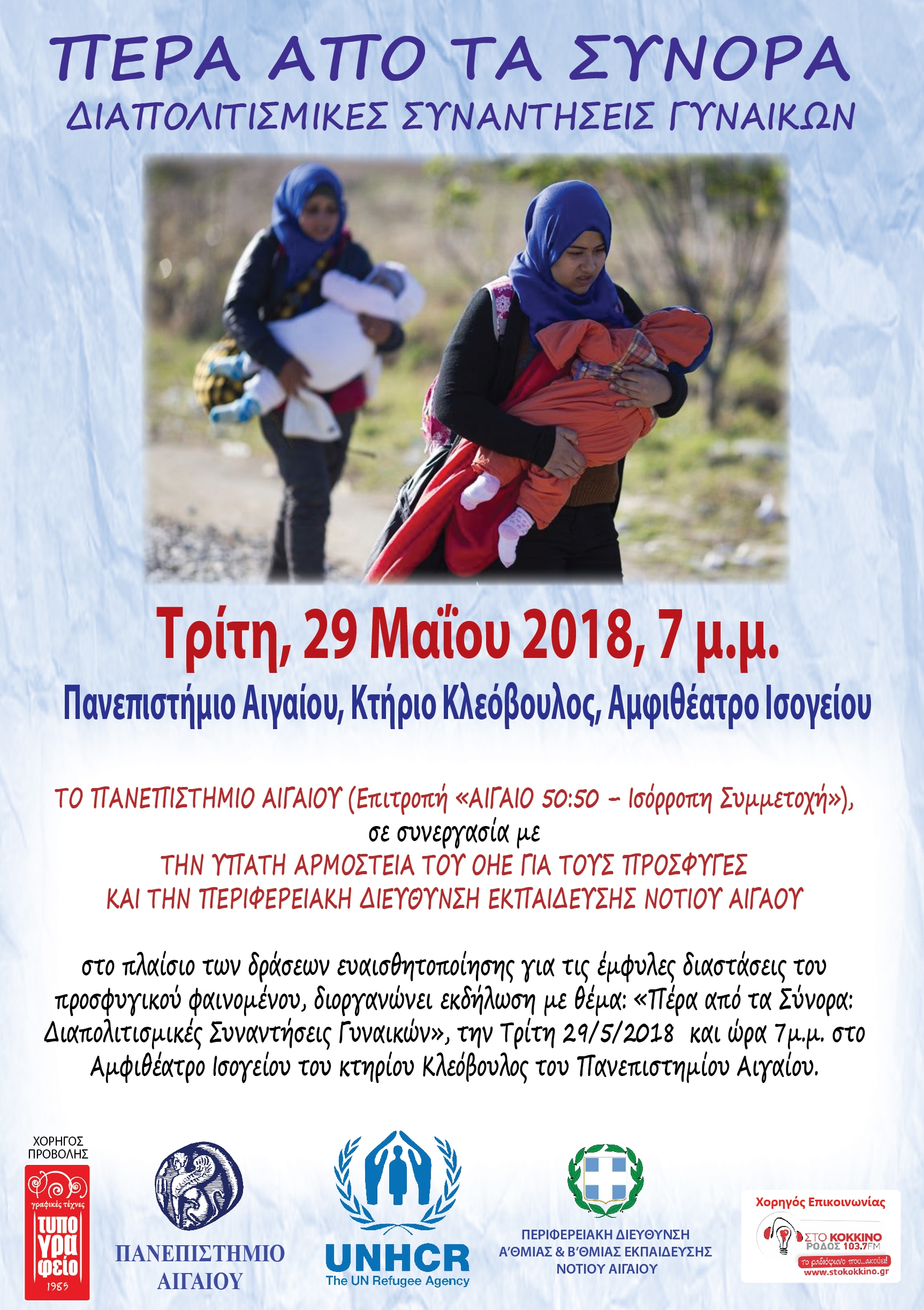 Η Επιτροπή «ΑΙΓΑΙΟ 50:50 – Ισόρροπη Συμμετοχή» του Πανεπιστημίου Αιγαίου, σε συνεργασία με την Ύπατη Αρμοστεία του ΟΗΕ για τους Πρόσφυγες, και την Περιφερειακή Διεύθυνση Α’θμιας & Β’θμιας Εκπαίδευσης Νοτίου Αιγαίου, στο πλαίσιο των δράσεων ευαισθητοποίησης για τις έμφυλες διαστάσεις του προσφυγικού φαινομένου, διοργανώνει εκδήλωση με θέμα: «Πέρα από τα Σύνορα: Διαπολιτισμικές Συναντήσεις Γυναικών», την Τρίτη 29/5/2018, και ώρα 7μ.μ., στο Αμφιθέατρο Ισογείου του κτηρίου «Κλεόβουλος» της Σχολής Ανθρωπιστικών Επιστημών του Πανεπιστημίου Αιγαίου (Λ. Δημοκρατίας 1, Ρόδος).