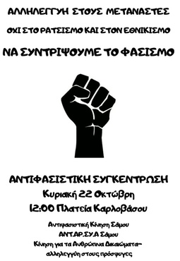 Καλούμε το Σαμιώτικο λαό, να εκδηλώσει τα πραγματικά του αισθήματα, του πολιτισμού, του ανθρωπισμού και της αλληλεγγύης προς τους μετανάστες και να στείλει ένα σαφές μήνυμα καταδίκης κάθε ρατσιστικής ρητορικής μίσους και φασιστικής τακτικής, στην αντιφασιστική συγκέντρωση, στη κεντρική πλατεία στο Καρλόβασι, την Κυριακή, 22 Οκτώβρη, στις 12.00 η ώρα. Να απαιτήσει και να διεκδικήσει :