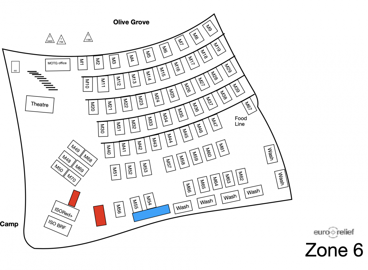 Οι ζώνες 6-8, βρίσκονται δεξιά (ανατολικά) του ΚΥΤ, κατά μήκος του τσιμεντένιου δρόμου που ανεβαίνει το λόφο και είναι υπό την ευθύνη και τον έλεγχο της οργάνωσης Movement on the Ground (MOTG: https://movementontheground.com/). Η οργάνωση έχει πραγματοποιήσει έργα υποδομών όπως σταθμούς για μπάνιο και τουαλέτα (Wash Facilities, βλ. εικ. 4) τους οποίους έχει συνδέσει και με το κεντρικό αποχετευτικό δίκτυο, αλλά και σταθμούς πυρόσβεσης με πυροσβεστήρες. (βλ. εικ. 6). Επίσης, έχει εγκαταστήσει σημεία διανομής φαγητού (Food Lines), αλλά το σημαντικότερο είναι ότι έχει πραγματοποιήσει έργα ισοπέδωσης του εδάφους (leveling) δημιουργώντας αναβαθμίδες στρωμένες με χαλίκι για τον περιορισμό της σκόνης και της λάσπης, αλλά και για καθαριότητα. Τέλος, έχει εγκατασταθεί και ηλιακός φωτισμός, ως ένα μέτρο προστασίας και μείωσης της επικινδυνότητας της βραδινές ώρες.