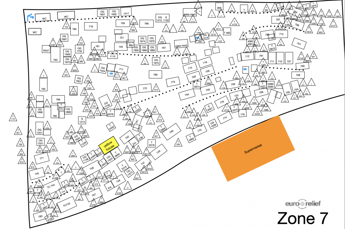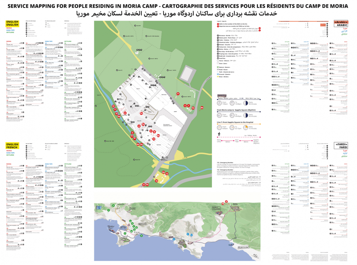 Οι ζώνες 9-12 είναι σαφώς λιγότερο οργανωμένες από τις 6-8 (χωρίς χαλίκι στο έδαφος, με λιγότερες έως καθόλου υποδομές ή φωτισμό, ενώ οι κατοικίες είναι κυρίως καλύβες ή παράγκες, οι οποίες είτε έχουν μέσα τους μικρές σκηνές ή αποτελούνται από κατασκευές με ξύλο, κλαδιά και άλλα μαζεμένα υλικά ή υλικά που προσφέρονται από τους μεγάλους οργανισμούς. Αν και είναι και αυτές αριθμημένες, δεν είναι με ταμπελάκια, όπως στις ζώνες 6-8, αλλά οι κωδικοί-αριθμοί είναι γραμμένοι με σπρέι πάνω στους «τοίχους» των καλυβών. Η κωδικοποίηση έχει γίνει, μάλλον, από την Eurorelief - την οργάνωση που έχει τη συνολική διαχείριση του καταυλισμού και έχει διακινήσει τα παραπάνω σχέδια - (https://www.eurorelief.net/) και αφορά, σύμφωνα με πληροφορητές μας, στην πληθυσμιακή σύνθεση της κάθε καλύβας-σκηνής κτλ (οικογένειες ή singles – εθνοτική καταγωγή κ.α.) και όχι στον τύπο της κατοικίας (σκηνή, καλύβα κλπ.), όπως αρχικά είχαμε την εντύπωση. Το πως μοιράζονται οι ρόλοι μεταξύ των οργανώσεων που δραστηριοποιούνται στον καταυλισμό, αλλά και οι αλλαγές που έχουν γίνει καθώς αυτός μετασχηματίζεται, αποτελεί ένα αρκετά περίπλοκο πεδίο που περιλαμβάνει ένα πλέγμα διακρατικών, διεθνών και ευρωπαϊκών οργανισμών, κρατικών φορέων και μη κυβερνητικών οργανώσεων. Η περιπλοκότητα του ανθρωπιστικού καθεστώτος της Μόριας δεν είναι πρόκληση μόνο για τον ερευνητή ή την ερευνήτρια που προσπαθεί να καταλάβει τις ισορροπίες που διαμορφώνονται, αλλά είναι καθημερινή πρόκληση και για τους ίδιους τους διαμένοντες, που είναι αυτοί και αυτές που ωφελούνται από τις προσφερόμενες υπηρεσίες. Χαρακτηριστικό αυτής της περιπλοκότητας είναι και η ανάγκη που οδήγησε τη διεθνή οργάνωση Oxfam (https://www.oxfam.org/) να φτιάξει πρόσφατα ένα χάρτη των υπηρεσιών του καταυλισμού σε τέσσερις διαφορετικές γλώσσες. Δυστυχώς η οργάνωση αποχώρησε από τη Λέσβο στις αρχές του 2020 και δεν πρόλαβε να τοιχοκολλήσει τους χάρτες στον καταυλισμό όπως σκόπευε (βλ. εικ. 9).