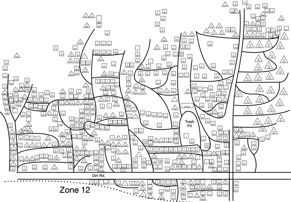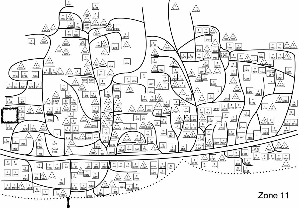 Ο δρόμος που κατεβαίνει, περνώντας από τις ζώνες 11 και 12, προς τον κύριο δρόμο μπροστά από το ΚΥΤ, έχει και αυτός διάφορα καταστήματα με τρόφιμα, είδη πρώτης ανάγκης, αλλά ακόμα και φούρνους με φρέσκο ψωμί12 (βλ. εικ. 17). Αντίστοιχα με τον τσιμεντόδρομο στην άλλη πλευρά του ΚΥΤ (ζώνες 6-9), η λειτουργία των άτυπων καταστημάτων εκφράζει όχι μόνο την εμπορική ανάπτυξη του ευρύτερου καταυλισμού, αλλά και την επακόλουθη ανάπτυξη χώρων συνάντησης και κοινωνικότητας, κι αυτό σημαντικό χαρακτηριστικό της ευρύτερης οργάνωσης του χώρου και ανάπτυξης του καταυλισμού-πόλης.