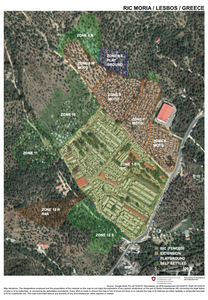 Όπως φαίνεται στη εικόνα 5, οι ζώνες 1 έως 5 (ανοιχτό πράσινο χρώμα ), βρίσκονται εντός του επίσημου καταυλισμού, ενώ οι ζώνες 6- 12 (όλα τα υπόλοιπα χρώματα) βρίσκονται εκτός της περίφραξης. Από τις ζώνες που είναι εκτός, αυτές που φαίνονται με κόκκινο χρώμα (6-9 και 11) διαχειρίζονται από δύο οργανώσεις (Refugees for Refigees [R4R] & Movement on the Ground (MOTG), οι οποίες έχουν πραγματοποιήσει έργα υποδομών, και γι αυτό αναφέρονται στο παραπάνω υπόμνημα (εικ. 4) ως «επεκτάσεις» (extension), ενώ αυτές με το πράσινο χρώμα είναι οι ζώνες που δεν υπό την ευθύνη διαχείρισης κάποιας οργάνωσης και στις οποίες δεν υπάρχουν καθόλου υποδομές (self-settled).