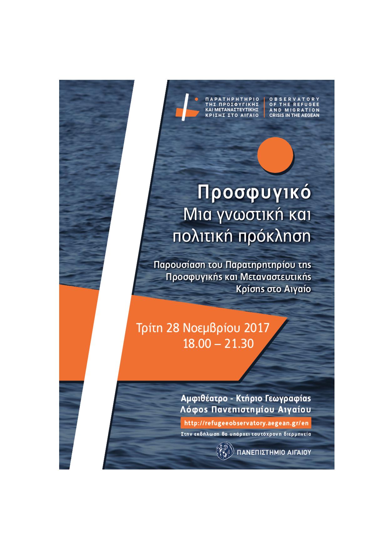Στο πλαίσιο της λειτουργίας του το Παρατηρητήριο της Προσφυγικής και Μεταναστευτικής Κρίσης στο Αιγαίο διοργανώνει μια εναρκτήρια εκδήλωση με θέμα: ΠΡΟΣΦΥΓΙΚΟ, ΜΙΑ ΓΝΩΣΤΙΚΗ ΚΑΙ ΠΟΛΙΤΙΚΗ ΠΡΟΚΛΗΣΗ. Στην εκδήλωση θα παρουσιαστεί το Παρατηρητήριο, η σελίδα του και το αποθετήριο του, ενώ θα γίνει συζήτηση πάνω στην αποστολή του Παρατηρητηρίου με τη συμμετοχή πολιτών που από διαφορετικές θέσεις έχουν εμπειρία της διακυβέρνησης του προσφυγικού στα νησιά του Αιγαίου. Η εκδήλωση θα διεξαχθεί στο αμφιθέατρο του κτηρίου Γεωγραφίας στο λόφο του Πανεπιστημίου Αιγαίου στη Μυτιλήνη την Τρίτη 28 Νοεμβρίου 2017, στις 18:00 - 21:30.