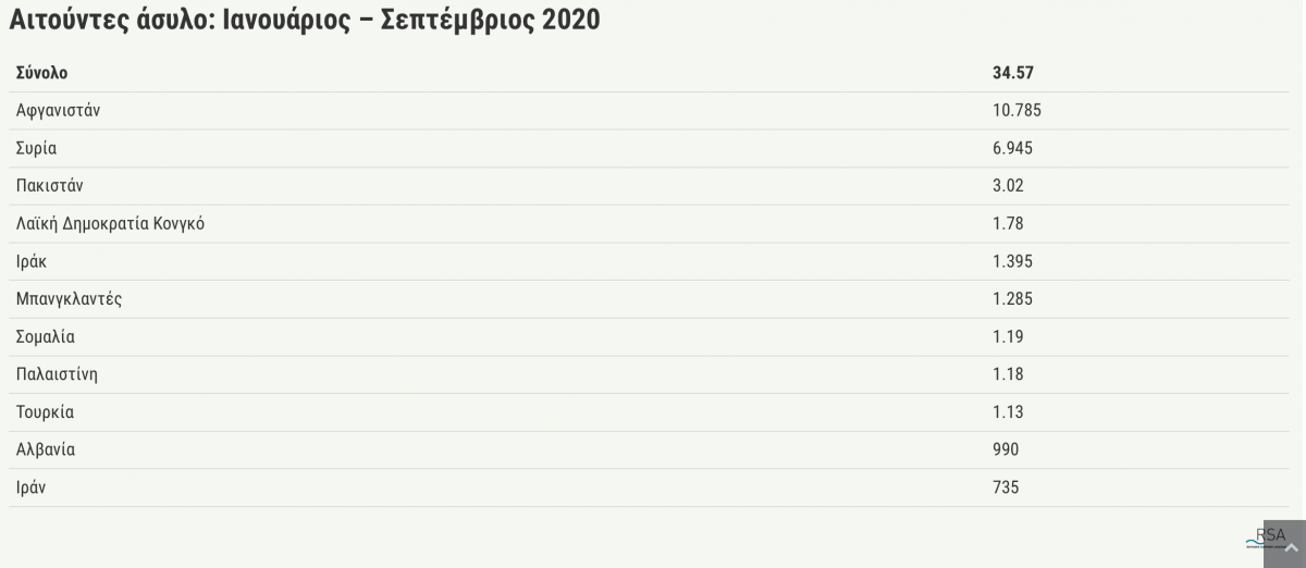 Οι κυριότερες χώρες καταγωγής των αιτούντων άσυλο που καταγράφηκαν τους πρώτους εννέα μήνες του 2020 ήταν οι κάτωθι: