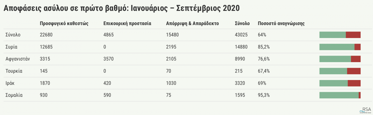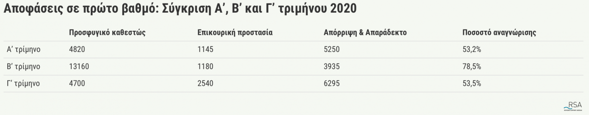 Σημειώνεται, ωστόσο, μείωση του ποσοστού θετικών αποφάσεων που εκδόθηκαν από την Υπηρεσία Ασύλου μεταξύ του δεύτερου και του τρίτου τριμήνου του 2020, ιδίως με διπλασιασμό του αριθμού απορριπτικών αποφάσεων σε Σύρους πολίτες από 1.060 σε 2.195 την εν λόγω περίοδο.