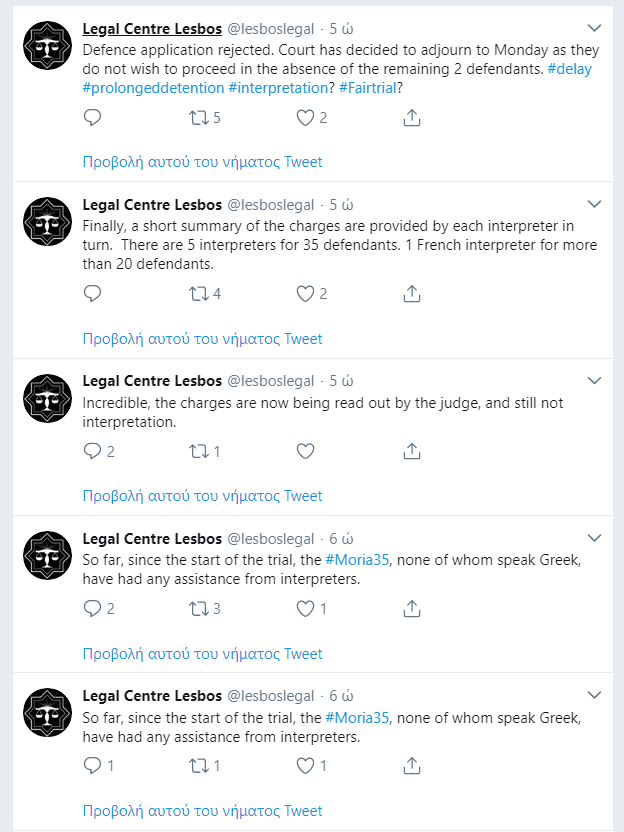 The trial started but two defendants were absent since they were still in Athens, so after the reading of the charges the Court decided to adjourn to Monday. As has been reported by Legal Center Lesbos, which was present at the courtroom, the interpreters during the trial were not enough for all the defendants and the charges were translated only as short summaries.