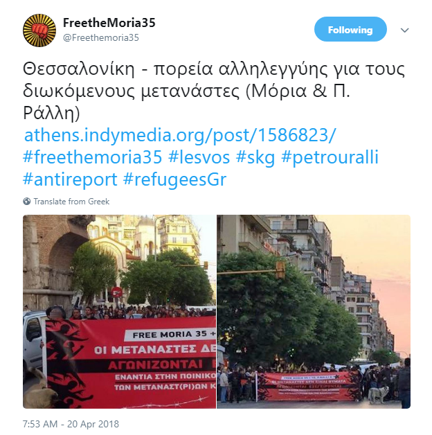 During the first day of the trial solidarity actions took place in Athens, Thessaloniki and in other cities in Europe and the US and they were published on Twitter as part of the campaign #freethemoria35