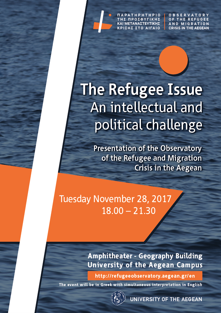 The Observatory of the Refugee and Migration Crisis in the Aegean is organizing an opening event entitled: THE REFUGEE ISSUE, AN INTELLECTUAL AND POLITICAL CHALLENGE. At the event, the Observatory, its Webpage and Digital Repository will be presented, followed by a discussion on the Observatory’s mission with the participation of citizens who, from various perspectives, have direct experience with the refugee issue on the Aegean islands. The event will take place at the Auditorium of the Geography building at the Campus of the University of the Aegean in Mytilene on Tuesday, November 28, 2017, at 18:00-21:30.