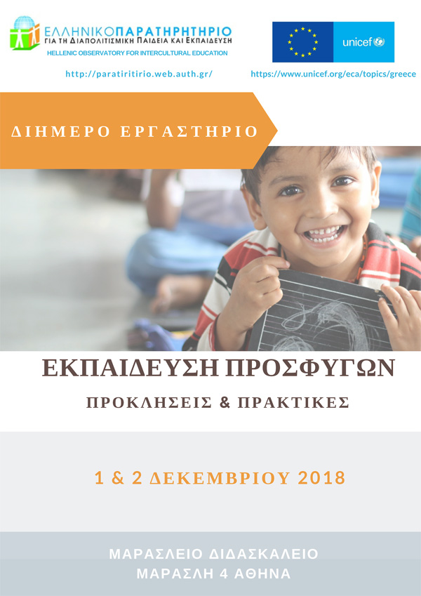 Το Ελληνικό Παρατηρητήριο για τη Διαπολιτισμική Παιδεία και Εκπαίδευση (Ε.ΠΑ.ΔΙ.Π.Ε.) / Όμιλος Ε.ΠΑ.ΔΙ.Π.Ε. Αττικής, σε συνεργασία με τη UNICEF (Refugee and Migrant Response in Greece), διοργανώνουν Διήμερο Εργαστήριο με θέμα «Εκπαίδευση προσφύγων. Προκλήσεις και πρακτικές».