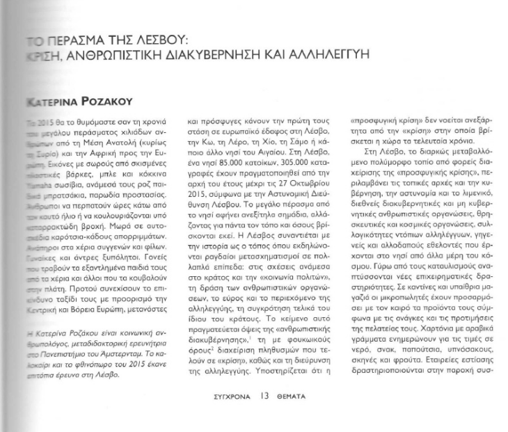 Cite as: Ροζάκου, K., 2015, «Το πέρασμα της Λέσβου: κρίση, ανθρωπιστική διακυβέρνηση και αλληλεγγύη». Σύγχρονα Θέματα 130–131: 13–16.