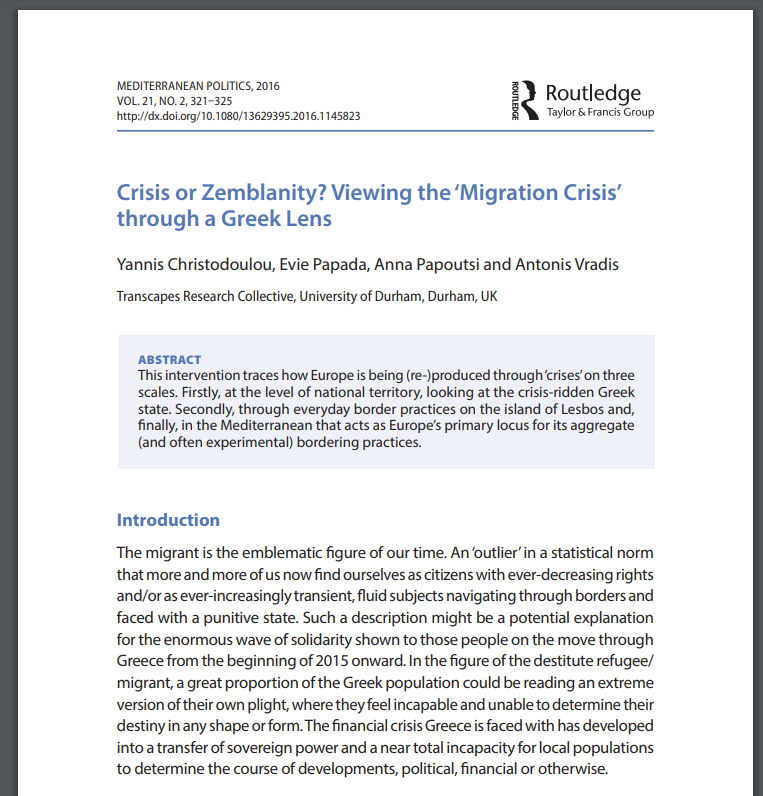 Cite as: Christodoulou, Y., Papada, E., Papoutsi, A. and Vradis, A., 2016, “Crisis or Zemblanity? Viewing the ‘Migration Crisis’ through a Greek Lens”. Mediterranean Politics 21(2): 321-325.​